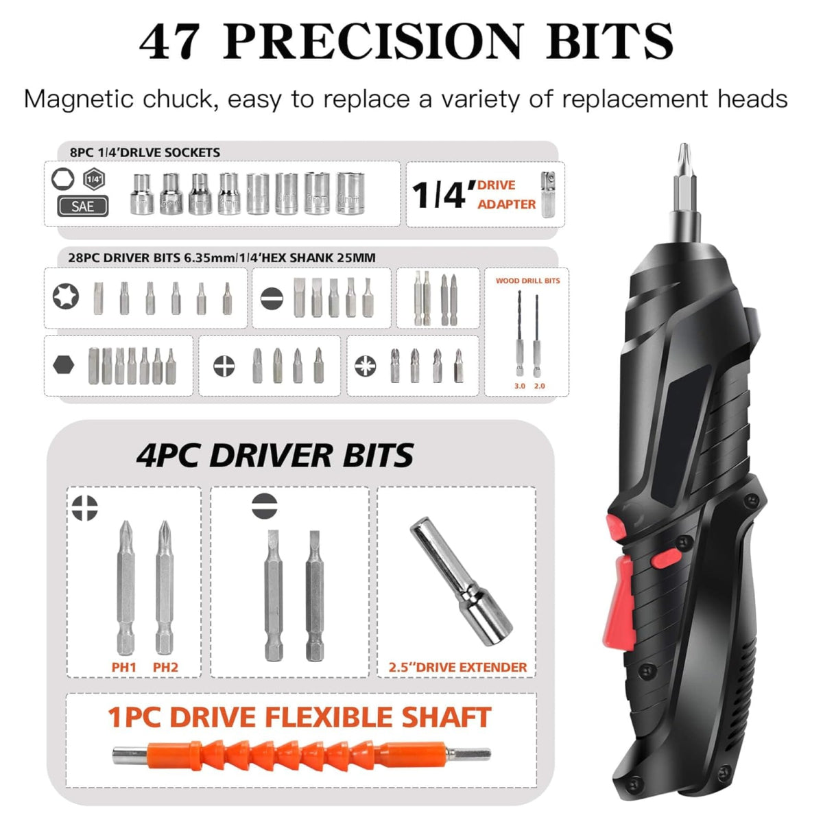 Todo lo que necesitas: Con 45 accesorios incluidos (puntas, llaves de tubo, extensores), no tendrás que correr a la ferretería a mitad del trabajo. Tienes la pieza exacta para cada tornillo.